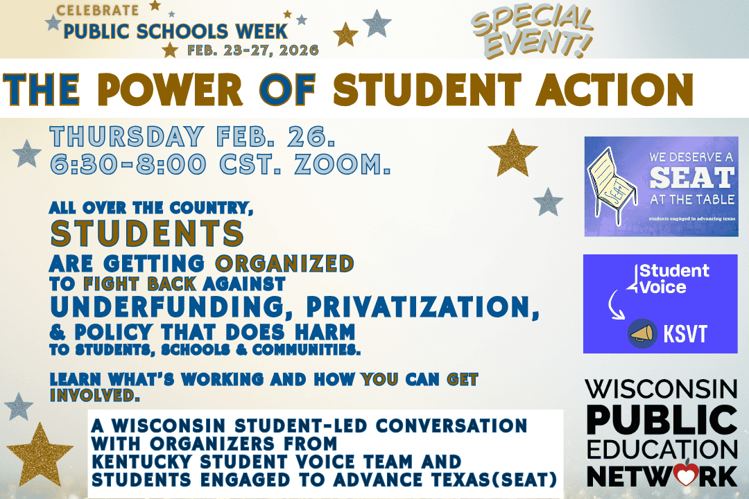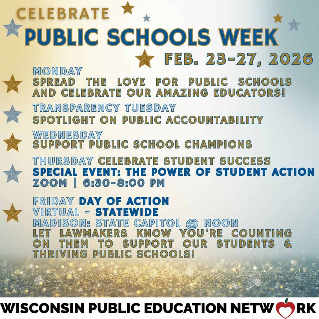 Dear Wisconsin public school champions, Public Schools Week is a time for celebration, appreciation, & action–and it’s never been more important to take time to do all three! We challenge you to commit to taking action during Public Schools Week, February 23-27. Learn more below! Our Public Schools Week 2026 toolkit contains ideas for taking action …